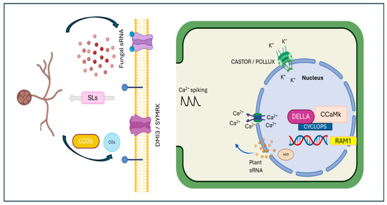AM colonization not only affects local root physiology but also induces systemic changes in the plant, impacting nutrition, development, and responses to both biotic and abiotic stresses. These systemic effects imply a root-to-shoot signaling axis that influences multiple aspects of plant biology. Metabolic changes in shoots are often observed in plants undergoing AM colonization, suggesting a coordinated response across the entire plant [10]. Additionally, systemic changes influence the plant’s ability to cope with environmental stresses, indicating that AM symbiosis has extensive benefits beyond the root system. For example, AM colonization can improve drought tolerance by enhancing water uptake and increasing the production of stress-related proteins and metabolites. It also aids in the uptake of less-mobile nutrients, such as zinc and copper, which are crucial for various plant metabolic processes [11,12]. Recent research has also highlighted the role of small RNAs (sRNAs) in regulating the AM symbiosis. These molecules are involved in regulating gene expression in both the plant and fungal partners. Some sRNAs have been found to act as mobile signals that can move between the plant and the fungus, influencing the symbiotic relationship at both local and systemic levels (Figure 2). This cross-kingdom RNA interference is a promising area of research that could unlock new strategies for optimizing AM symbiosis for agricultural benefit. The aim of this review was to delve deeper into the key molecular processes involved in the AMF–plant interaction. By understanding the molecular mechanisms underlying this sophisticated symbiotic relationship, different strategies to enhance plant growth and productivity may be developed, especially in challenging environmental conditions.