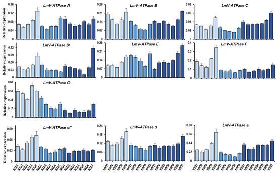The RT-qPCR reactions were performed with SYBR Green qPCR Master Mix (TaKaRa, Tokyo, Japan) according to the manufacturer’s recommendations on a Bio-Rad system (Bio-Rad Laboratories, Hercules, CA, USA). The primer sequences are listed in Table S1. Each 20 μL sample RT-qPCR reaction contained 10 μL of 2× SYBR qPCR Master Mix, 1.6 µL of sense and antisense primer mixture (10 μM), 3 μL of cDNA templates and 5.4 μL of ddH2O. The RT-qPCR cycling conditions were as follows: 95 °C for 30 s, followed by 40 cycles of 95 °C for 15 s and 60 °C for 31 s. The relative mRNA levels of LmV-ATPase were normalized to the expression of the internal marker gene β-actin, which was previously demonstrated to be stably expressed in different tissues and at different stages [44]. A melting curve was verified for each RT-qPCR to determine the specificity of primers. The relative gene expression levels among LmV-ATPases were calculated using 2−ΔCT methods. Tukey’s HSD multiple comparison test was used to show the significant differences of the relative expressions LmV-ATPases in different tissues and developmental stages in L. migratoria.