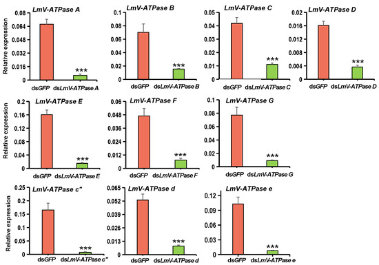 The expression of each LmV-ATPase after RNAi, examined using RT-qPCR. (Student’s t-test; ***, p < 0.001).