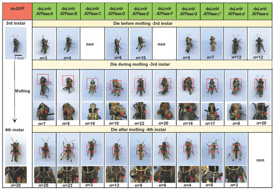 Phenotypes after injection dsRNA against each LmV-ATPase (arrows). Insects injected with dsLmV-ATPase died before molting, during molting and after molting.