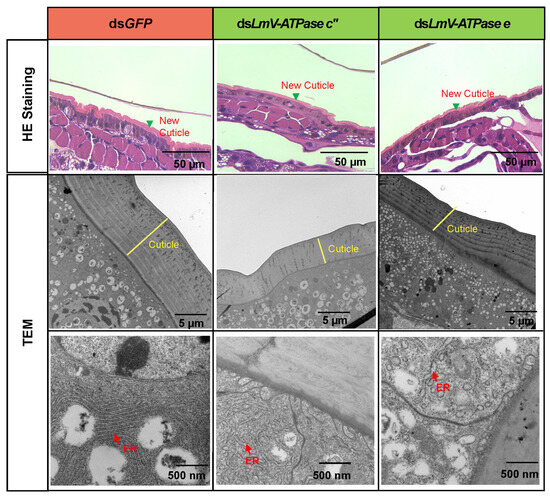 To observe the effects of dsLmV-ATPase c″ and dsLmV-ATPase e on the cuticle of locusts at the ultrastructural level, TEM was further performed. As shown in Figure 6, in the dsGFP-treated nymphs, the new cuticle was normally synthesized with multiple laminaes visible, but the new cuticle was obviously thinner in the dsLmV-ATPase c″ and dsLmV-ATPase e-injected locusts. In addition, the endoplasmic reticulum showed a normal form in the controls. However, in the dsLmV-ATPase c″-treated and dsLmV-ATPase e-treated nymphs, endoplasmic reticulum swelling was evident.