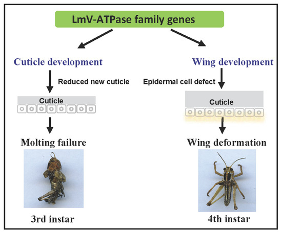 In summary, we first identified LmV-ATPase genes (LmV-ATPase-A, B, C, D, E, F, G, c″, d and e), and among them, LmV-ATPase c″ and LmV-ATPase e were found to contain transmembrane regions. Then, RT-qPCR results further showed that LmV-ATPase genes might exert functions in multiple tissues and across developmental stages. The knockdown of each LmV-ATPase gene using RNAi resulted in defective development of the epidermal cuticle and the epidermis of the wings (Figure 8). These results showed the possibility of leveraging LmV-ATPase in L. migratoria control.