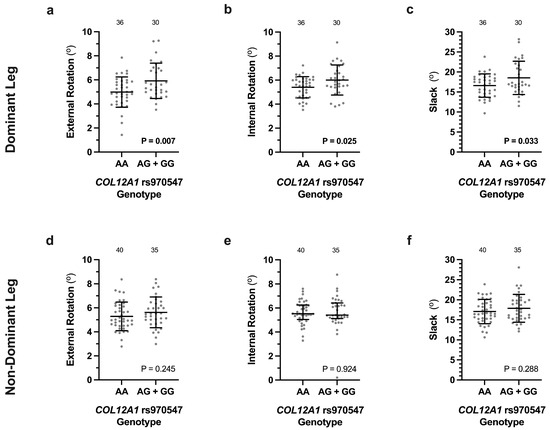 The average external (5.0 ± 1.3°, p = 0.007) and internal (5.4 ± 0.9°, p = 0.025) tibial rotation, as well as slack (16.6 ± 2.9°, p = 0.033), of the dominant leg of participants with a COL12A1 rs970547 AA genotype (n = 36) were significantly lower than those with either an AG or GG genotype (G-allele carrier) (5.9 ± 1.5° external rotation; 6.0 ± 1.3° internal rotation; 18.5 ± 4.2° slack; n = 30) (Figure 1a–c). There were, however, no significant differences in external rotation (p = 0.254), internal rotation (p = 0.924), or slack (p = 0.288) between the COL12A1 rs970547 genotype groups of the non-dominant leg (Figure 1d–f).