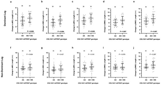 The COL12A1 rs970547 (A/G) genotype effects on the absolute change in the calculated length of the (a,f) anterior bundle of the superficial layer of the MCL (aMCL), (b,g) inferior bundle of the superficial layer of the MCL (iMCL), (c,h) posterior bundle of the superficial layer of the MCL (pMCL), (d,i) anterior bundle of the deep layer of the MCL (aDMCL), and (e,j) posterior bundle of the deep layer of the MCL (pDMCL) during internal to external tibial rotation of the uninjured dominant (a–e) and non-dominant (f–j) legs. The dominant and non-dominant leg ligament length changes are expressed as average ± standard deviation and median (IQR) respectively. The rare GG (dominant leg n = 4, non-dominant leg n = 5) genotype and the GA genotype were combined for the analysis. The individual values are shown as light grey circles, and the number of participants in each group is indicated. Significantly different p values are indicated in bold.