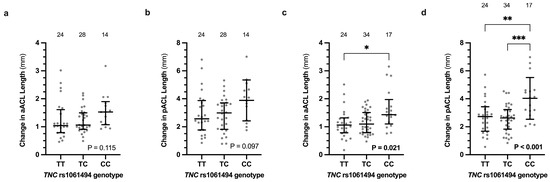 The TNC rs1061494 (T/C) genotype effects on the absolute change in the calculated length of the (a,c) anterior bundle of the ACL (aACL) and (b,d) posterior bundle of the ACL (pACL) during internal to external tibial rotation of the uninjured (a,b) dominant and (c,d) non-dominant legs. The aACL length changes are expressed as median (IQR), while the pACL length changes are expressed as average ± standard deviation. The individual values are shown as light grey circles, and the number of participants in each group is indicated. Significantly different p values are indicated in bold with post-hoc analysis differences indicated with asterisks. * p < 0.05, ** p < 0.001, and *** p < 0.0001.