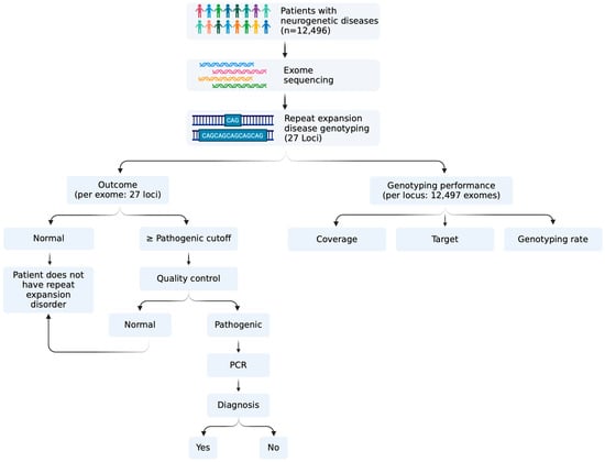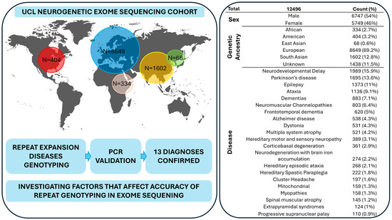 - Ibañez, K.; Polke, J.; Hagelstrom, R.T.; Dolzhenko, E.; Pasko, D.; Thomas, E.R.A.; Daugherty, C.L.; Kasperaviciute, D.; Smith, R.K.; WGS for Neurological Diseases Group; et al. Whole genome sequencing for the diagnosis of neurological repeat expansion disorders in the UK: A retrospective diagnostic accuracy and prospective clinical validation study. Lancet Neurol. 2022, 21, 234–245. [Google Scholar] [CrossRef] [PubMed]