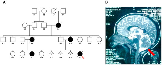 Pedigree of SCA3 family and MRI scan of proband. The red arrow shows the proband. (A) Square = male; circle = female; black filled symbol = affected individual; white symbols = unaffected individuals; diagonal line = deceased individual. Double lines indicate consanguinity. (B) MRI scan of patient IV.8. The red arrow indicates cerebellar atrophy.