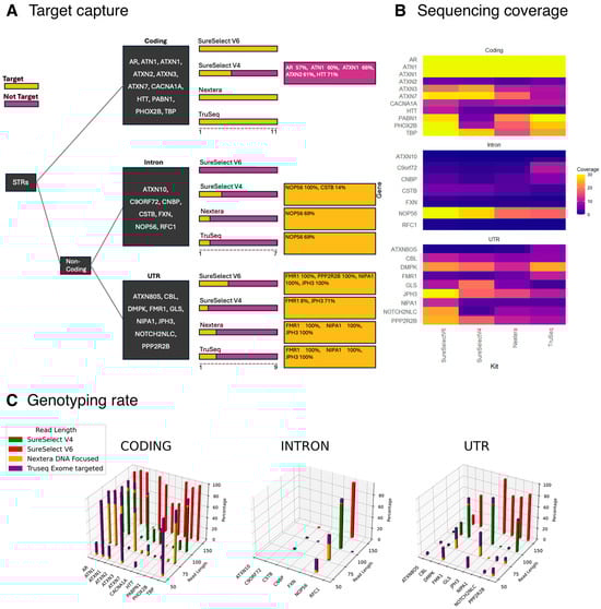 Targeted loci and coverage according to the four most used exome sequencing kits in this cohort. (A) The RED loci are categorised based on their genomic location: coding, intron and UTR. Target (purple): the specific region of the gene is targeted by the exome kit. Not target (yellow): the region of interest is not covered by the exome kit. The percentage indicates how much of the region is not covered. For example, in ATN1, 60% of the region of interest is not covered by the SureSelect V4 kit. When not specified, the percentage of target or not target is 0%. The exome sequencing kits are represented by different bars: SureSelect V6, SureSelect V4, Nextera and TruSeq. The dashed lines under each group indicate the total number of RED loci analysed in each category: 12 coding, 7 intronic and 8 UTRs. (B) Heatmap showing the coverage of the analysed RED loci across different genomic regions. Coverage is represented by the number of sequencing reads mapping to each locus, as indicated by the colour scale. (C) 3D plots of the genotyping rate for EH-generated calls by read length and sequencing kit. The three plots show EH calls in coding, intron and UTR loci. In each plot, calls are divided by locus and read length. The four different colours represent the different exome capture kits used.