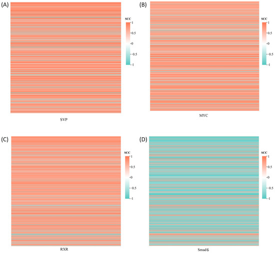 Co-expression analysis of DETF and DEGs. SCC: Spearman correlation coefficient. Each row represents a DEG. (A) Co-expression of DEGs with SVP; (B) Co-expression of DEGs with MYC; (C) Co-expression of DEGs with RXR; (D) Co-expression of DEGs with Smad6.