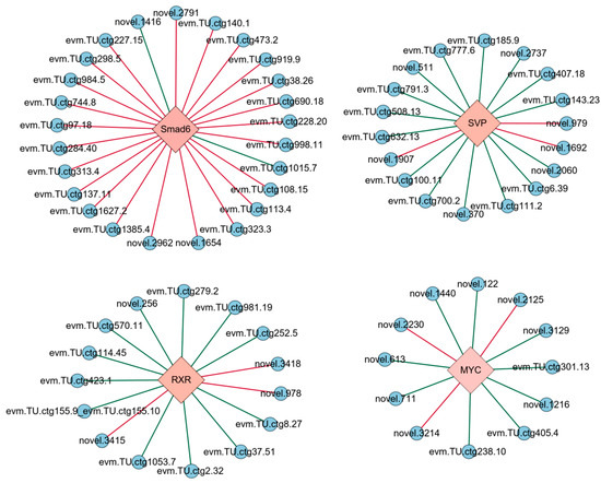 The co-expression analysis was conducted between four DETFs and 650 DEGs identified from the transcriptome, with the results displayed in Figure 2. Co-expression relationships meeting the thresholds of |SCC| ≥ 0.9 and p-value ≤ 0.01 were selected to construct a transcriptional regulatory network linking the TFs with their target genes (Figure 3). The genes regulated by the four DETFs performed distinct biological functions. The target genes of SVP were predominantly involved in cell adhesion and signal transduction, with evm.TU.ctg777.6 (WNT7B) participating in the Wnt signaling pathway. Additionally, the target gene evm.TU.ctg6.39 (AGPAT5) exhibited transferase activity to transfer phosphorus-containing groups. MYC regulated the target gene evm.TU.ctg155.9_evm.TU.ctg155.10 (DMD), which plays a role in protein binding. The target gene evm.TU.ctg155.9_evm.TU.ctg155.10 (how) of RXR was involved in RNA binding, while evm.TU.ctg1053.7 (UCK2) showed transferase activity to transfer phosphorus-containing groups. Smad6 regulated genes involved in signal transduction, cell adhesion, and oxidation–reduction processes. The DETF-regulated genes along with their GO annotations are provided in Supplementary File S5.