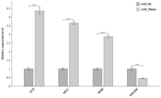 The expression of the DETFs between the ArR_30min and ArD_0h datasets were further verified with RT-qPCR. The results are shown in Figure 4. Based on the RT-qPCR results, SVP, MYC and RXR were upregulated, and SMAD6 was downregulated, which was completely consistent with the integration analysis of the ATAC-seq and RNA-seq datasets. The results of the RT-qPCR further verified the significant differential expression of the DETFs and also confirmed the reliability of the integrated analysis based on the two high-throughput sequencing techniques.