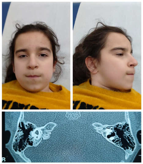 The proband was a single-born from an uneventful pregnancy of non-consanguineous parents without a family history of genetic or neurological diseases. The parents reported three previous spontaneous miscarriages during the first trimester. A cesarean section was performed because of the lack of progress in labor. Her auxological parameters at birth were as follows: weight, 3730 g (+1.37 SD); length, 52 cm (+1.61 SD); and occipitofrontal circumference (OFC), 36 cm (+1.87 SD). Her Apgar score was 8 and 9, at the first and fifth minute, respectively. She was fed with valid suction. At birth, a bilateral periauricolar fistula was noticed and auditory evoked potentials were performed, revealing hearing loss. At 1 year, brain and ear MRI was performed, which evidenced agenesis of the left cochlea, while a sketch of a cochlea was present on the right; therefore, acoustic prosthesization was prescribed. A CT scan was later performed, documenting the complex malformation of the inner ears (Figure 1). The ophthalmological evaluation showed iris, chorioretinal, and optic nerve coloboma with microphthalmia and subluxation of the crystalline lens on the right eye, and chorioretinal coloboma on the left eye. At the cardiological evaluation, a patent ductus arteriosus was documented. She underwent endocrinological evaluation because of growth retardation. Growth hormone (GH) stimulation tests ruled out GH deficiency. She presented with menarche at the age of 15 with irregular menses.