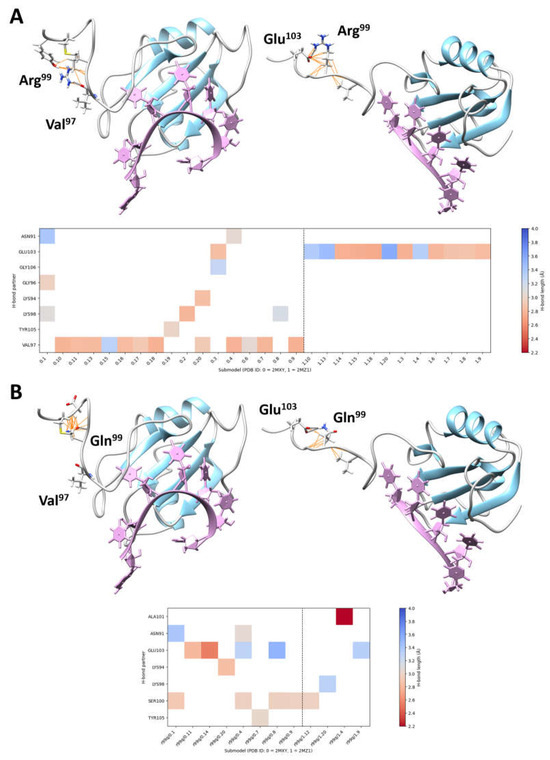Intramolecular interactions involving Arg99 and perturbations introduced by the pathogenic Arg99Gln substitution. (A) The 3D structures of the single-stranded RNA-binding motif (RBM) of HNRNPC complexed with RNA consensus sequences (PDB ID 2MXY, submodel 18, 5′-AUUUUUC-3′, left; PDB ID 2MZ1, submodel 9, 5′-UUUUC-3′, right) are shown, with secondary structures and loops colored in sky blue and grey, respectively (top panel). The RNA consensus sequences are plum-colored. H-bonds (black dashed lines) and van der Waals bonds (orange lines) involving Arg99 are shown. The two most frequent H-bonds observed in the NMR spectrometry models (i.e., involving Val97 and Glu103) are also indicated (left and right, respectively). The plot (bottom panel) shows all the intramolecular H-bonds involving Arg99, colored by H-bond length. (B) By considering the same 3D structures, the substitution of the arginine residue by a non-charged polar residue, glutamine, abolishes binding to Val97 (left) and weakens binding to Glu103 (right) (top panel). The plot (bottom panel) shows all the intramolecular H-bonds involving Gln99, colored by H-bond length.