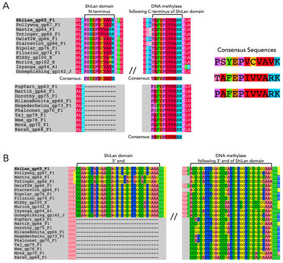 Comparison of the N-terminal/5′ end of the ShiLan domain insertion sequence to the sequence of the methylase on the C-terminal/3′ side of the insertion site. (A). Amino acid sequence alignment of homologous DNA methylases from several phages, some containing the ShiLan domain insertion, and some not. The gene product (gp) number and phage cluster to which each phage belongs is denoted next to their name. The start and end of the ShiLan domain sequence are pictured. The first 11 amino acid residues of the ShiLan domain insertion and the first 11 amino acid residues of the methylase on the C-terminal side of where the ShiLan domain inserts itself have darker text and are indicated with brackets. Consensus sequences for the amino acid regions described are provided. Amino acid residues are colored by functional group. (B). Nucleotide sequence of the regions described in (A).