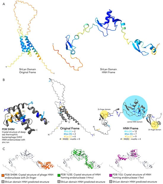 Comparison of the predicted protein structure for the ShiLan domain read in the frame of the methylase and in the alternate frame to solved HNH endonuclease structures. AlphaFold was used to generate predicted protein structures for the ShiLan domain read in the frame of the methylase it invades (original frame) and in the alternate frame encoding an HNH endonuclease (HNH frame). (A). The predicted protein structures for the two frames, both colored according to pLDDT model confidence []. (B). A solved crystal structure of a phage HNH endonuclease with one zinc finger domain, PDB entry 5H0M [], (left) compared to the structures for the two frames (right). All three structures are colored by residue, with histidine in light blue, asparagine in dark blue, cysteine in yellow, and all others in gray. These residues are important for HNH endonuclease activity, with histidine and asparagine residues comprising the HNH domain, and with pairs of CXX(X)C motifs comprising the zinc finger domains when present. (C). The matchmaker tool in ChimeraX was used to align three separate experimentally solved crystal structures of different HNH endonucleases (a phage HNH endonuclease (PDB 5H0M []) and two HNH homing endonucleases (PDB 1U3E [] and PDB 1I3J []).