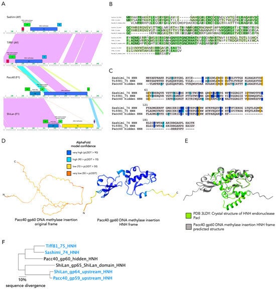 A different cluster F1 phage, Pacc40, with a divergent DNA methylase (Pacc40 gp60) was found to also have an out-of-frame HNH endonuclease insertion at a different position. Pacc40 gp60 contains a DNA helicase domain followed by a DNA methylase domain, per BLASTP and HHpred searches, thus making its annotation difficult. Similar to the ShiLan domain, the protein sequence of Pacc40 gp60’s insertion sequence when read in-frame with the methylase cannot be assigned any known function (Table 2) and yields a disordered predicted protein structure with poor confidence (Figure 5D). In contrast, an alternate ORF within the insertion yields a 160 aa long protein sequence which retrieved matches to HNH endonucleases and similar proteins (Table 2) and yields a more ordered and confident structural prediction (Figure 5D). The Pacc40 gp60 DNA methylase is included in a different PhagesDB pham (protein family) than the methylases discussed so far, despite this methylase being in the same genomic context. Efforts to align the Pacc40 gp60 DNA methylase to the ShiLan DNA methylase (ShiLan gp65) with all insertion elements removed from both using clustalo [], MUSCLE [], and MAFFT [] alignment algorithms all produced poor alignments (available at the GitHub repository provided []). The Pacc40 gp60 methylase is more closely related to DNA methylases found in the cluster AY phages Sashimi and Tiff81 (Sashimi gp75 and Tiff81 gp76) (Figure 5). Interestingly, the phages Tiff81 and Sashimi both harbor an HNH endonuclease similar to that inside Pacc40’s methylase gene (Tiff81 gp75 and Sashimi gp74) upstream of the methylase gene (Figure 5A). Due to the phages Sashimi and Tiff81 having only draft annotations at the time of writing, support for the annotations of Sashimi gp74 and Tiff81 gp75 as HNH endonucleases and Sashimi gp75 and Tiff gp76 as DNA methylases using BLASTP, HHpred, and NCBI Conserved Domain Search as described for Table 1 are provided at the GitHub repository for this work []. Additionally, these gp numbers may change in the final versions of the Tiff81 and Sashimi annotations.