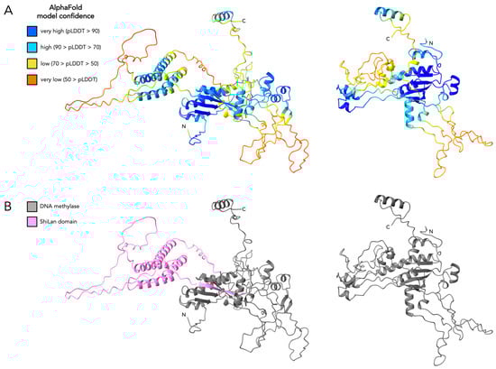 Predicted protein secondary structure of ShiLan gp65 DNA methylase with and without the ShiLan domain insertion. (A). AlphaFold was used in ChimeraX to generate a predicted structure for ShiLan gp65 (DNA methylase) with its intein removed and the ShiLan domain included (left) and with its intein and ShiLan domain removed (right). Both structures are colored according to AlphaFold-provided per-residue pLDDT confidence score. (B). The structures described in (A), with the DNA methylase colored dark gray and the ShiLan domain colored light pink.