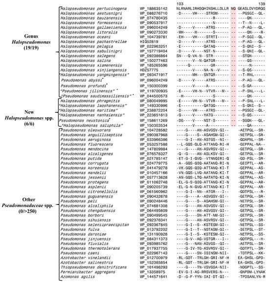 Two of these species in this figure are listed as “Pseudomonas” as they have not yet been reclassified as Halopseudomonas due to the lack of availability of the type strains in two different culture collections. Since the publication of this work, six other species related to Halopseudomonas have been described [4,6,43,44]. Some of these species presently are either not validly published (indicated by their placement within “ ”) or they are misclassified into the genus Neopseudomonas [6], which is a homotypic synonym of Halopseudomonas [38]. Nonetheless, as shown in Figure 1, the 2 aa CSI specific for the Halopseudomonas is commonly and uniquely shared by all six newly described species related to Halopseudomonas, but it is not found in any other Pseudomonadaceae species. In a phylogenetic tree that we have constructed, all species share this CSI group reliably within a clade corresponding to the genus Halopseudomonas (Figure S1). These results provide further evidence supporting the predictive ability of taxon-specific CSIs to be found in other species/strains that are related to them.