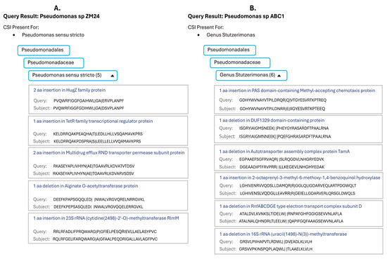 In Figure 2, we show the results obtained from the server for two Pseudomonas strains/isolates. The server indicates that the strain ZM24 is related to the Pseudomonas sensu stricto clade, and its genome contained five CSIs specific for this clade (Figure 2A). On the other hand, the server predicted that the genome of strain ABC1 is related to the genus Stutzerimonas, and its genome contained six CSIs specific for this genus (Figure 2B). In addition to indicating the numbers of CSIs specific to the predicted taxon, the server also provides sequence information for all matching CSIs, which can be viewed upon clicking the down arrow beside the number of CSIs.