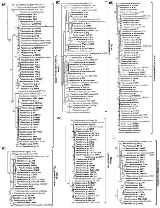 Phylogenetic branching of Pseudomonas spp. (strains/isolates), which based upon the results obtained from AppIndels server (Table 2 and Table S4) were predicted to be related to the genera (A) Pseudomonas sensu stricto, (B) Phytopseudomonas, (C) Stutzerimonas, (D) Chryseomonas, (E) Ectopseudomonas, and (F) Metapseudomonas. All strains for which the server made taxonomic predictions branched with 100% accuracy with the indicated genera in this tree.
