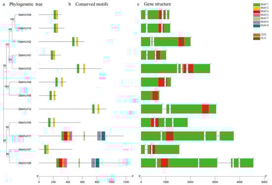 To gain a deeper understanding of the structural components of the SbbHLH genes, we conducted an analysis of their exon–intron structures. The number of introns varied among the SbbHLH genes, ranging from 0 to 5 (Figure 1a,c). The majority of SbbHLH genes (41.67%) contained two introns, while the other genes predominantly had three introns. Notably, SbbHLH8 contained the highest number of introns, totaling five, whereas SbbHLH6 was found to have no introns.