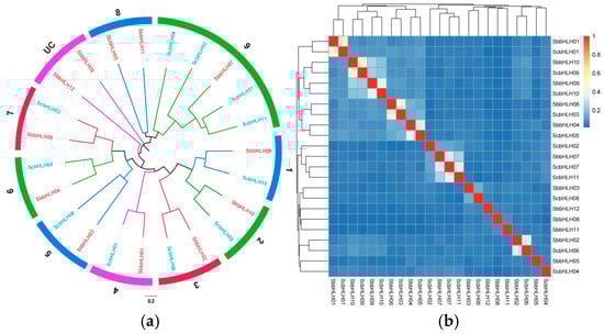 For a better understanding of the evolutionary relationship between S. baumii and model basidiomycete Schizophyllum commune, multiple sequence alignment was conducted using ClustalW, focusing on the amino acid sequences of 12 SbbHLH and 11 ScbHLH proteins (Tables S2 and S4). Subsequently, a phylogenetic tree was constructed utilizing the neighbor-joining (NJ) method with a bootstrap value of 1000, implemented in Mega X (Figure 2a). The phylogenetic analysis revealed that the 23 bHLH genes were categorized into nine distinct clades, along with one unclassified group (UC) that encompassed two SbbHLH proteins (SbbHLH8 and SbbHLH12). Notably, none of the ScbHLH proteins were placed in subfamily 8, which exclusively contained two SbbHLH proteins (SbbHLH5 and SbbHLH11), suggesting a potential novel evolutionary pathway for S. baumii. Among the identified subfamilies, subfamily 9 was the most populous, comprising five bHLH members, while the remaining subfamilies each contained two members.