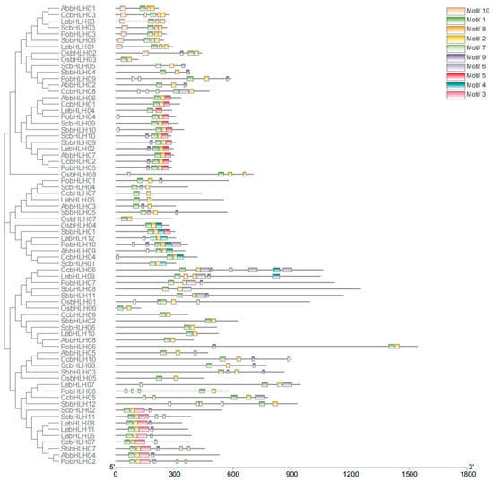 To investigate the evolutionary relationships of bHLH proteins in S. baumii and six other macrofungus species (S. commune, A. bisporus, O. sinensis, P. ostreatus, C. cinerea, and L. edodes), we constructed an unrooted neighbor-joining tree incorporating 10 conserved motifs identified by the MEME web server (Figure 3, Table S4). The distribution of SbbHLHs in the phylogenetic tree is notably widespread. With the exception of LebHLH4, all other proteins from the six macrofungi analyzed contained Motifs 1 and 2. Moreover, we observed that the bHLH proteins from L. edodes, P. ostreatus, and S. baumii clustered on the same phylogenetic branch, indicating a generally similar motif composition among them. This suggests a closer evolutionary relationship between SbbHLH proteins and those found in L. edodes and P. ostreatus. Overall, individuals within the same subfamily displayed comparable patterns of conserved motifs, and supporting the reliability of the phylogenetic analysis.