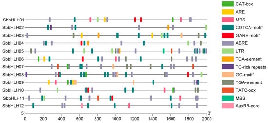 To infer the potential function of SbbHLH genes, the upstream 2000 bp sequence from the transcription start site of each gene was extracted from the S. baumii genome, and the PlantCare website (https://bioinformatics.psb.ugent.be/webtools/plantcare/html/, accessed on 12 September 2024) was utilized for the prediction of cis-acting elements [31].