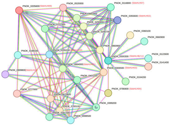 Protein–protein interaction networks were predicted using the STRING database (https://cn.string-db.org/, accessed on 19 September 2024) [32]. A total of 12 SbbHLH protein sequences served as queries, with orthologs from Phellinus noxius (as S. baumii was formerly classified under the genus Phellinus) selected as references. The interaction network for SbbHLH proteins was constructed utilizing the proteins with the highest scores from BLAST analysis.