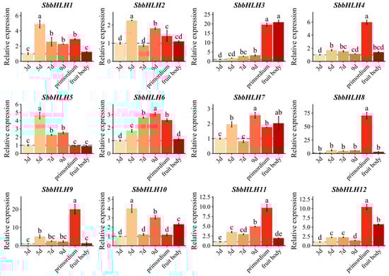 Gene expression of 12 SbbHLH genes determined by qRT-PCR during different developmental stages of S. baumii. (The data shown are mycelium cultured for 3~9 days: 3d, 5d, 7d, and 9d; primordium; and fruit body.) The error bars represent the standard error of the mean of three technical replicates. Lowercase letters indicate significant differences among treatment means (α = 0.05, LSD). The dashed line indicates that the relative expression level of the gene reaches “1”, making it easy to compare with the control.