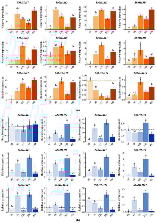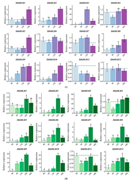 The expression profile of 12 SbbHLH genes in S. baumii under abiotic stresses as evaluated by qRT-PCR: (a) heat treatment; (b) cold treatment; (c) H2O2 treatment; and (d) CdCl2 treatment. The error bars represent the standard error of the mean of three technical replicates. Lowercase letters indicate significant differences among treatment means (α = 0.05, LSD). The dashed line indicates that the relative expression level of the gene reaches “1”, making it easy to compare with the control.