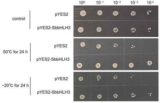 To explore the roles of bHLH family genes in the abiotic stress response of S. baumii, SbbHLH3 was selected for preliminary functional validation based on qRT-PCR expression levels. The coding sequence of SbbHLH3 was cloned into pYES2 plasmids and subsequently transformed into Saccharomyces cerevisiae strains INVSC1. The successful recombinant yeast strains (pYES2-Sb-bHLH3) were confirmed through PCR analysis (Figure S2). Both the positive and control INVSC1 yeast cells were cultured on SD-Ura with different abiotic stress treatments. As shown in Figure 8, under non-stress conditions, there was no notable difference in growth between the control (pYES2) and the transformed yeast (pYES2-Sb-bHLH3), indicating that the overexpression of SbbHLH3 does not affect yeast growth. In contrast, after exposure to heat (50 °C) or cold (−20 °C) stress, the transformed yeast (pYES2-Sb-bHLH3) exhibited superior growth compared to the empty vector control (pYES2).