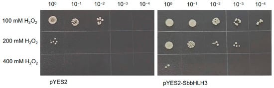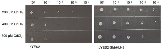 Furthermore, the pYES2-Sb-bHLH3 yeast strain and the control yeast were cultured under varying concentrations of CdCl2 and H2O2 stress. The results showed that both CdCl2 and H2O2 stress significantly affected yeast cell growth. However, it was evident that the growth of the pYES2-Sb-bHLH3 yeast strain was notably superior to that of the control (Figure 9 and Figure 10). For example, under 200 mM H2O2 stress, the pYES2 control yeast cells did not exhibit any growth after dilution, whereas the pYES2-Sb-bHLH3 yeast continued to grow even after a 1000-fold dilution. This suggests that the overexpression of SbbHLH3 enhances the yeast’s resistance to oxidative stress. In summary, these results indicate that SbbHLH3 may play a beneficial role in the response of fungi to abiotic stress.