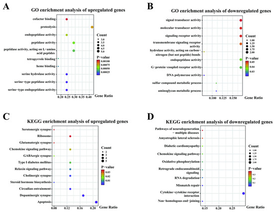 GO functional enrichment analyses of DEGs in the blood from horses in AT versus BT groups were analyzed, and the top 10 GO term entries in each GO category were selected for display. Up-regulated genes were enriched in 105 GO entries, of which they were significantly enriched in 34 GO entries (p < 0.05), mainly in GO entries related to G protein-coupled receptor binding, chemokine activity, heme binding, serine-type peptidase activity, and proteolysis (Figure 2A). Down-regulated genes were enriched in 50 GO entries, of which they were significantly enriched in 7 GO entries (p < 0.05), mainly in GO entries for the aminoglycan metabolic process, sulfur compound metabolic process, G-protein-coupled receptor activity, and DNA polymerase activity (Figure 2B). In KEGG pathway analysis, up-regulated genes were enriched in 101 pathways, of which they were significantly enriched in 24 pathways (p < 0.05). Twelve pathways were screened for the possible regulation of equine athletic performance, including apoptosis, the dopaminergic synapse, circadian entrainment, steroid hormone biosynthesis, the cholinergic synapse, the relaxin signaling pathway, type I diabetes mellitus, the GABAergic synapse, the hemokine signaling pathway, the glutamatergic synapse, ribosome, and the serotonergic synapse (Figure 2C). Down-regulated genes were enriched in 21 KEGG pathways, with significant enrichment in 3 KEGG pathways (p < 0.05). Screening was conducted of 10 pathways, including non-homologous end-joining, cytokine-cytokine receptor interaction, mismatch repair, RNA degradation, retrograde endocannabinoid signaling, oxidative phosphorylation, the chemokine signaling pathway, diabetic cardiomyopathy, amyotrophic lateral sclerosis, and the pathways of neurodegeneration-multiple diseases, which may modulate equine athletic performance (Figure 2D).