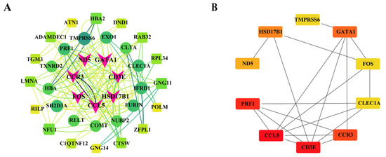 Mapping of identified DEGs to the Search Tool for the Retrieval of Interacting Genes (STRINGs) database (http://string-db.org/, accessed on 12 September 2024). PPI networks were built using Cytoscape software (version 3.10.0) and core genes were identified using the MCC model in the CytoHubba plugin.