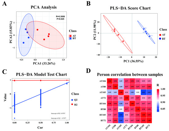 To ensure the stability of the overall test, PCA and correlation analyses were performed on the test samples. PC1 and PC2 accounted for 33.26 percent and 15.83 percent of the total variation (Figure 4A). To better distinguish the differences between groups, PLS-DA analysis was performed on top of PCA analysis, which showed significant differences between groups (Figure 4B,C). The correlation between the samples tends to be closer to 1.00 (Figure 4D). The above results showed that there was a significant difference in the plasma of horses in the AT and in the BT groups.