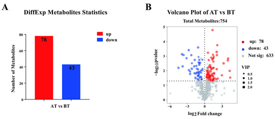 Metabolome analysis of equine plasma in AT versus BT. (A) The number of up- and down-regulated differentially expressed metabolites. (B) Volcano plot for differential metabolites expression (n = 4).
