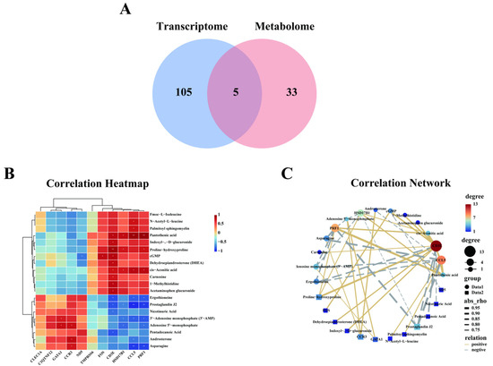 Integrated analysis of metabolomic and transcriptomic profiling of AT and BT. (A) Venn diagram of shared KEGG terms among transcriptome and metabolome. (B) Correlation heatmap of differentially expressed genes and metabolites for the integrated pathway. *, **: significant positive or negative correlation. (C) Correlation network of differentially expressed genes and metabolites for the integrated pathway.