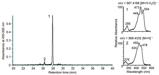 N. spongiae JCM 13191T produces orange pigment. Following the organic solvent extraction of the pigments, an LC-MS analysis revealed two pigment peaks (Figure 2 and Figure S2). The retention time of peak 1 was 28.0 min with absorption maxima at 295, 449, 473, and 504 nm in the HPLC eluent. The positive-ion high-resolution mass spectrum detected a molecular ion at m/z 567.4168 ([M+H-H2O]+, calculated as 567.4197 for C40H55O2), corresponding to myxol. The retention times of peak 2 was 26.3 min with absorption maxima at 276, 424, 450, and 478 nm. The positive-ion high-resolution mass spectrum detected a molecular ion at m/z 569.4332 ([M+H]+, calculated as 569.4353 for C40H57O2), corresponding to zeaxanthin. Thus, two carotenoids were identified, and they were predicted from the gene cluster same as above.
