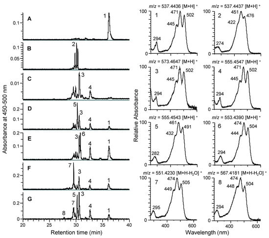 The LC-MS analysis of the carotenoids produced by the E. coli cells harboring different combinations of plasmids. The HPLC chromatograms are shown on the left, and the PDA spectra and LC-MS molecular ions for each peak are shown on the right. MS spectra are shown in Figure S3. (A) pACCRT-EIB, encoding crtE, crtB, and crtI from P. ananatis and pETDuet1 (the empty vector); (B) pACCRT-EIB and pETDuet-Y; (C) pACCRT-EIB and pETDuet-F; (D) pACCRT-EIB and pETDuet-FY; (E) pACCRT-EIB and pETDuet-FYD; (F) pACCRT-EIB and pETDuet-FYDA; (G) pACCRT-EIB and pETDuet-FYDAZ. Peak 1, lycopene; peak 2, β-carotene; peak 3, dihydroxylycopene; peak 4, hydroxylycopene; peak 5, 1′-hydroxy-γ-carotene; peak 6, 1′-hydroxytorulene; peak 7, deoxy-myxol; and peak 8, myxol.