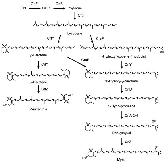 Several genes involved in myxol synthesis have been studied in flavobacteria and cyanobacteria. In Flavobacterium sp. strain P99-3, functions of lycopene cyclase (CrtYm) [], carotene hydroxylase (CrtZ) [], carotenoid 3,4-desaturase (ψ-end group) (CrtD) [], and carotenoid 2-hydroxylase (ψ-end group) (CrtA-OH) [] were investigated. Similarly, in cyanobacteria, the CruF protein from Synechococcus sp. strain PCC 7002 was functionally identified as a carotenoid 1,2-hydratase []. However, the functions of some of these genes remain unknown.