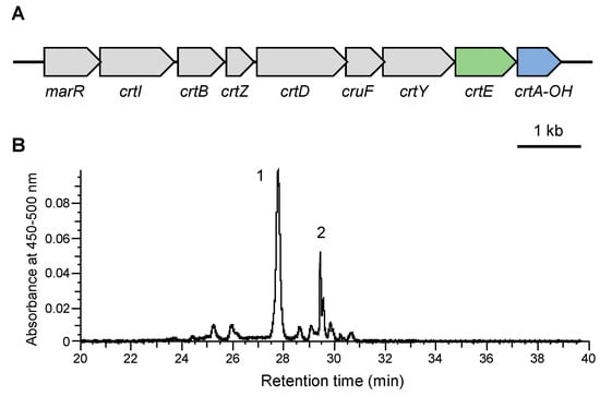 DNA fragments containing genes from the carotenogenic gene cluster of N. spongiae, cruF, crtY, crtD, crtA-OH, and crtZ were amplified alone or in combination by PCR and inserted into two multiple cloning sites (MCS1 and MCS2) of the pETDuet-1 vector (Merck KGaA), as shown in Figure S1. These plasmids were introduced into E. coli strain JM109 along with pACCRT-EIB, which contained the three carotenoid biosynthesis genes crtE, crtB, and crtI from Pantoea ananatis []. The transformants were cultured at 37 °C in 100 mL of a 2YT medium containing chloramphenicol (15 mg L−1) and ampicillin (50 mg L−1) until the OD600 reached 0.4–0.6. The transformants were then treated with 0.05 mM isopropyl-β-D-thiogalactopyranoside (IPTG), followed by culture at 25 °C with 200 rpm for 48 h.