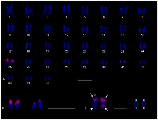 Amblypygi: Charontidae: Charon cf. grayi, female (A,B) and male (C); karyotype (A), chromosome pairs (B), and bivalents (C) indicating NORs (red) (FISH, DAPI staining). Centromeric blocks DAPI-positive. (A) Female karyotype (based on mitotic metaphase). Two acrocentric pairs (nos 25, 31) bear terminal NOR locus. (B) NOR-bearing chromosome pairs from another female mitotic metaphase, each with NOR locus at end of short arm. (C) Two NOR-bearing rod-like bivalents from male diakinesis (left) and their scheme (right). Left bivalent is heterozygous for presence of NOR; centromeric block of this bivalent associated with NOR (arrow) is larger than block without NOR (arrowhead). In the scheme, centromeric blocks with associated NOR are encircled by red. Abbreviation: h, bivalent heterozygous for presence of NOR. Arrow = centromeric block with associated NOR, arrowhead = centromeric block without associated NOR. Scale bars = 10 μm.