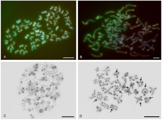 2.4. Detection of NORs and Telomere Repeats by Fluorescence In Situ Hybridization (FISH)