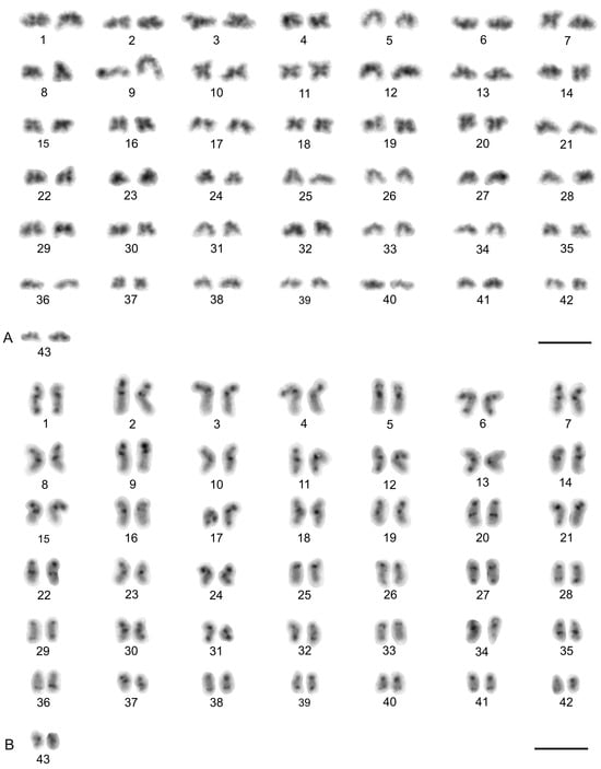 - Schneider, M.C.; Cella, D.M. Karyotype conservation in 2 populations of the parthenogenetic scorpion Tityus serrulatus (Buthidae): rDNA and its associated heterochromatin are concentrated on only one chromosome. J. Hered. 2010, 101, 491–496. [Google Scholar] [CrossRef] [PubMed]