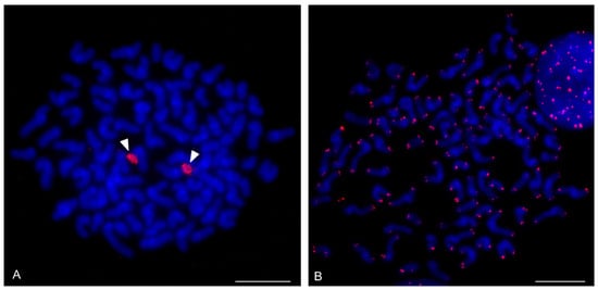 Amblypygi: Phrynidae: Acanthophrynus coronatus, male, pattern of NORs and telomeric repeats (red), mitotic metaphases (FISH, DAPI staining). (A) Visualization of NORs. Centromeres DAPI-positive. Chromosomes of subtelocentric pair each include NOR. (B) Visualization of telomeric repeats. Arrowhead = NOR. Scale bars = 10 μm.