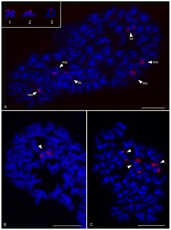 Amblypygi: Phrynichidae: Euphrynichus amanica (A), E. bacillifer (B), and Phrynichus ceylonicus (C), male plates illustrating patterns of NORs (red) (FISH, DAPI staining). (A) Two fused sister metaphases II. One metacentric pair with NOR locus and two monoarmed pairs each with NOR locus on short arm. All NOR loci are terminal. Inset: NOR-bearing chromosomes from another metaphase II. Each pair represented by one chromosome. Note metacentric (1), subtelocentric (2), and acrocentric morphology (3) of NOR-bearing chromosomes. (B) Metaphase II. Chromosome of metacentric pair with pericentric NOR. (C) Metaphase II. Three metacentric chromosomes (belonging to different chromosome pairs) each bear terminal NOR. Abbreviations: m, metacentric NOR-bearing chromosome; mo, monoarmed NOR-bearing chromosome. Arrowhead = NOR-bearing chromosome. Scale bars = 10 μm.
