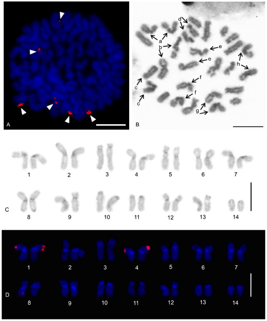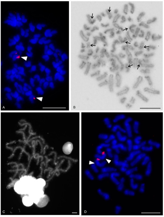 Thelyphonida: Thelyphonidae: Mastigoproctinae: Uroproctus assamensis (A) and Mastigoproctus giganteus (B–D), male mitotic metaphases. DAPI (A,D) and Giemsa (B,C) staining. (A) Visualization of NORs (red, FISH). Chromosomes of three pairs each with terminal NOR. (B) Associations of homologs. Letter pairs indicate putative homologs. (C) C-banded karyotype. Centromeric block of CH in all chromosome pairs; chromosomes of two pairs (second and eighth pair) with both centromeric and terminal CH. (D) Karyotype indicating pattern of NORs (red, FISH). Centromeres DAPI-positive. Two metacentric pairs each with terminal NOR locus. Arrowhead = NOR. Scale bar = 10 μm.