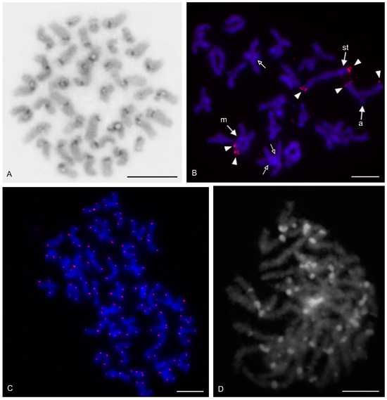 Thelyphonida: Thelyphonidae: Thelyphoninae: Ginosigma sp. (A–C) and Thelyphonus cf. linganus (D), male plates, patterns of heterochromatin, NORs, and telomeric repeats. Giemsa (A) and DAPI (B–D) staining. (A) C-banded mitotic metaphase. Centromeric CH in all chromosomes. (B) Diplotene, visualization of NORs (red, FISH). Centromeric regions are DAPI positive. Terminal NOR locus in metacentric, subtelocentric, and acrocentric bivalent. (C) Two sister metaphases II, visualization of telomeric repeats (red, FISH). (D) Pachytene (DAPI staining), bivalents exhibit prominent AT-rich knobs. Abbreviations: a, acrocentric bivalent; m, metacentric bivalent; st, subtelocentric bivalent. Arrowhead = NOR; open arrow = pericentric chiasma. Scale bars = 10 μm.