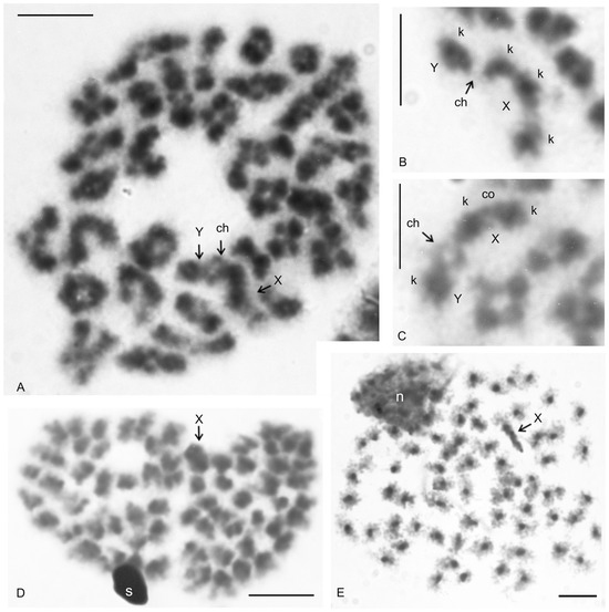 Thelyphonida: Thelyphonidae: Thelyphoninae: Thelyphonus cf. linganus, behaviour of male sex chromosomes. (A) Diakinesis, note heterobivalent comprising larger (putative X) and smaller (putative Y) chromosomes. (B,C) Sex chromosome bivalent during early (B) and late (C) diplotene. X chromosome includes three knobs at early diplotene (B), two of which fuse during late diplotene; fusion of knobs accompanied by formation of constriction between remaining two knobs (C). Y chromosome contains one knob throughout diplotene and diakinesis (A–C). (D) Anaphase I, note heterochromatinization of putative X chromosome. (E) Unusual interphase nucleus containing fuzzy chromosomes. Putative X chromosome forms heterochromatic body. Abbreviations: ch, chiasma; co, constriction; k, knob; n, deformed interphase nucleus; s, sperm nucleus; X, putative X chromosome; Y, putative Y chromosome. Scale bars = 10 μm.